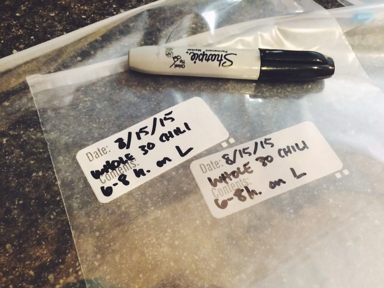 - Using a permanent marker, clearly label your meals so you know what food is in what container and how long it has been in there. I also like to write simple cooking instructions, i.e. “Bake at 350 degrees for 30-45 min.” That way, my husband can easily grab something out and know what it is and exactly how to cook it.