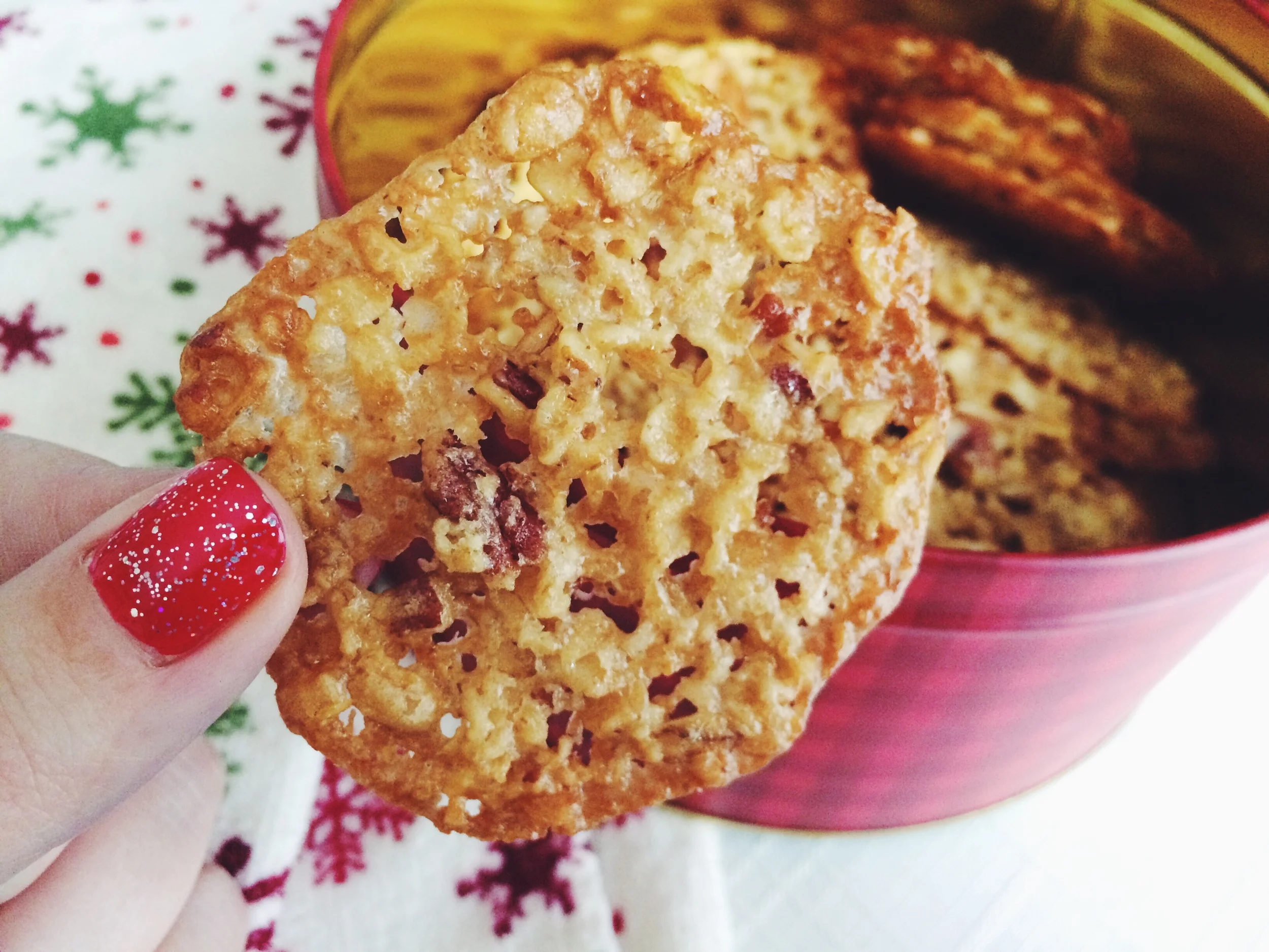 Merry Christmas Eve! Around the holidays, I like to try out new cookie recipes. This past weekend, I found this one for Oatmeal Pecan Lace Cookies!