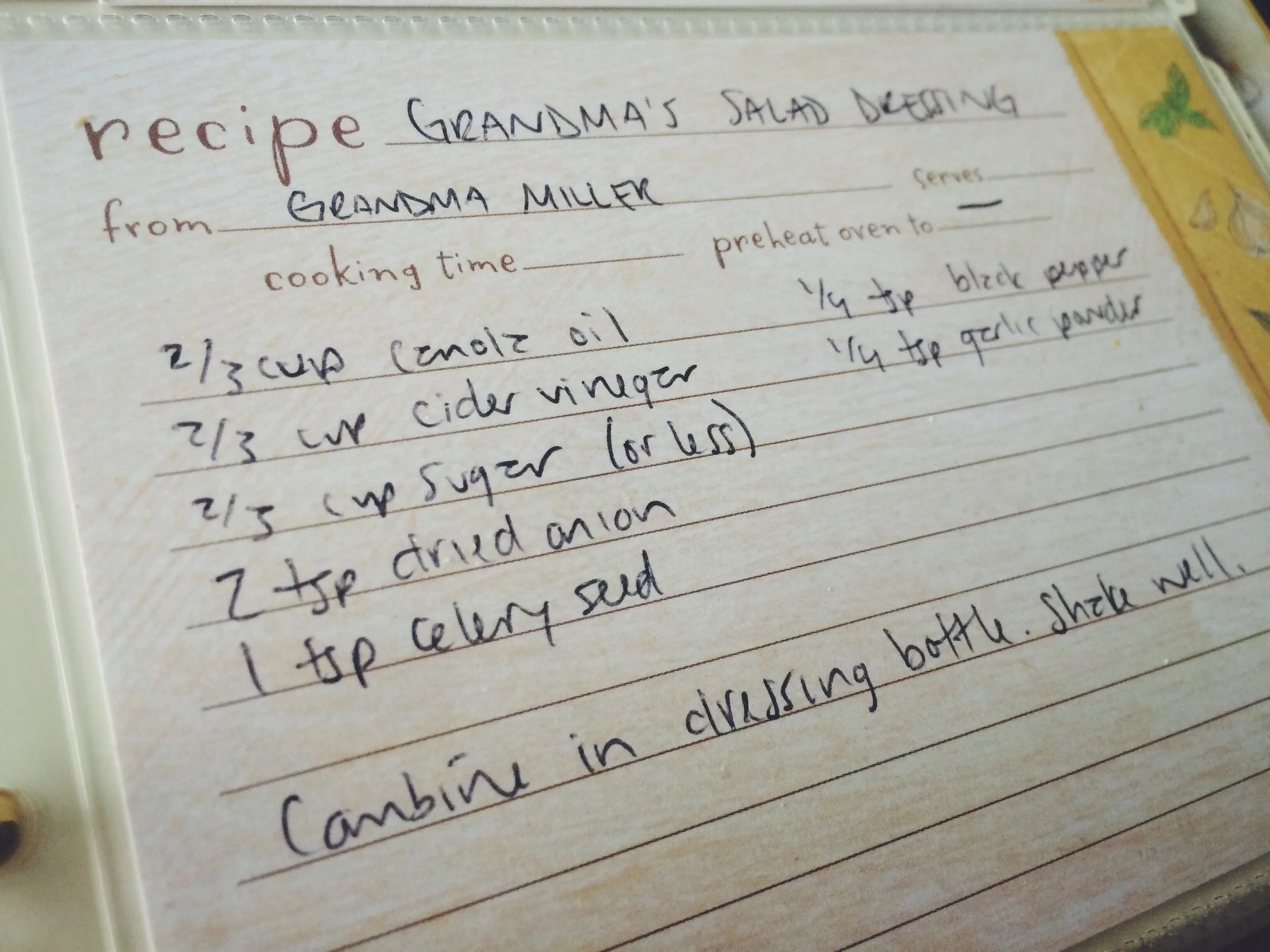 Ahh this dressing. It is my absolute favorite! I have tasted sweet & sour dressing at restaurants and different brands at the grocery store, but none of them come close to my grandma's recipe. Lucky for me, it is super easy to make, and I inherited her salad dressing bottle! They just don't make nice glass bottles like this anymore!